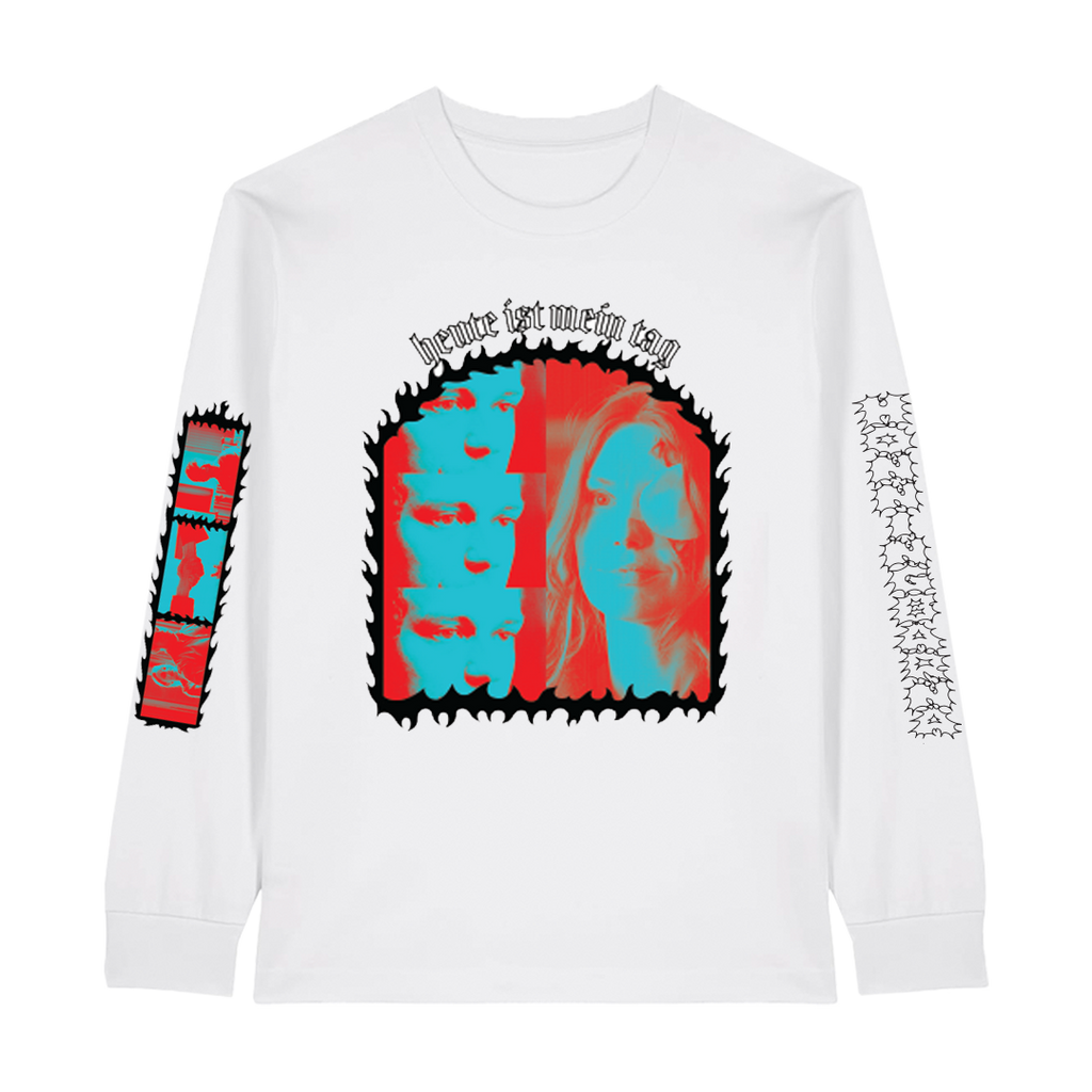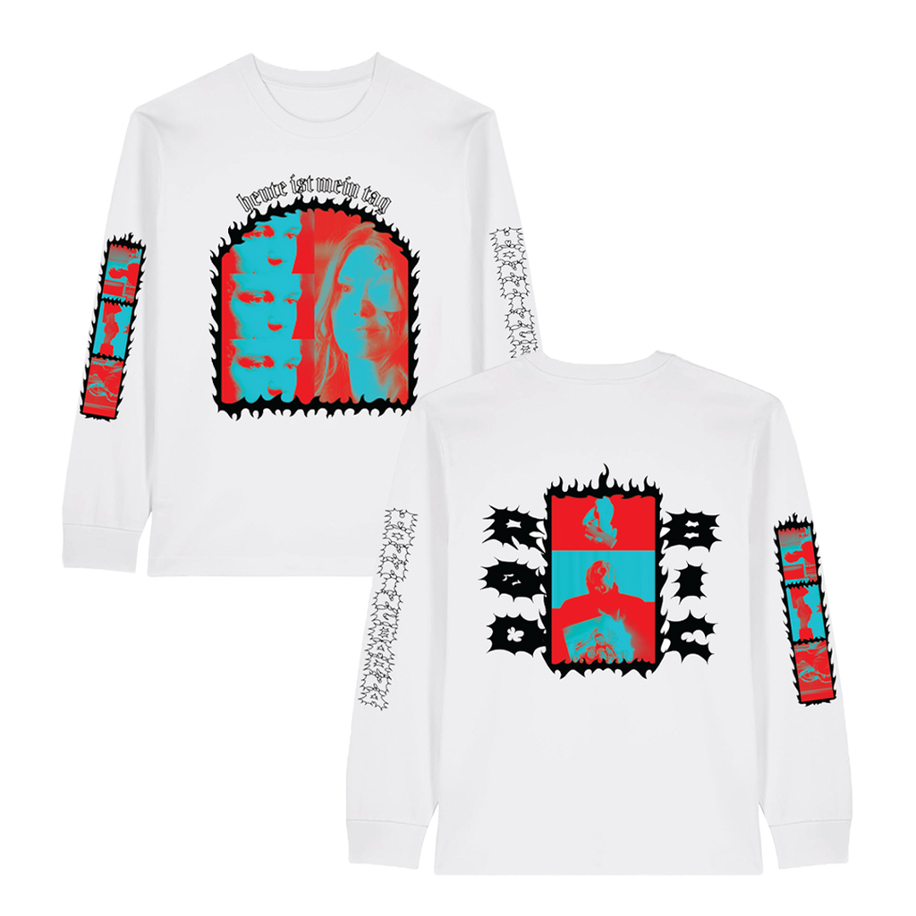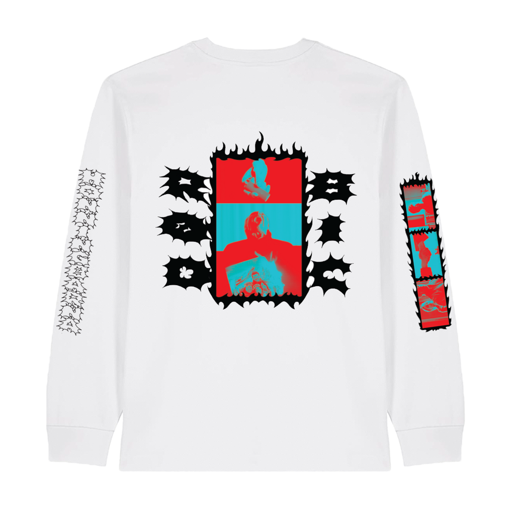 Hvit longsleeve med trykk på begge armer, rygg og front.