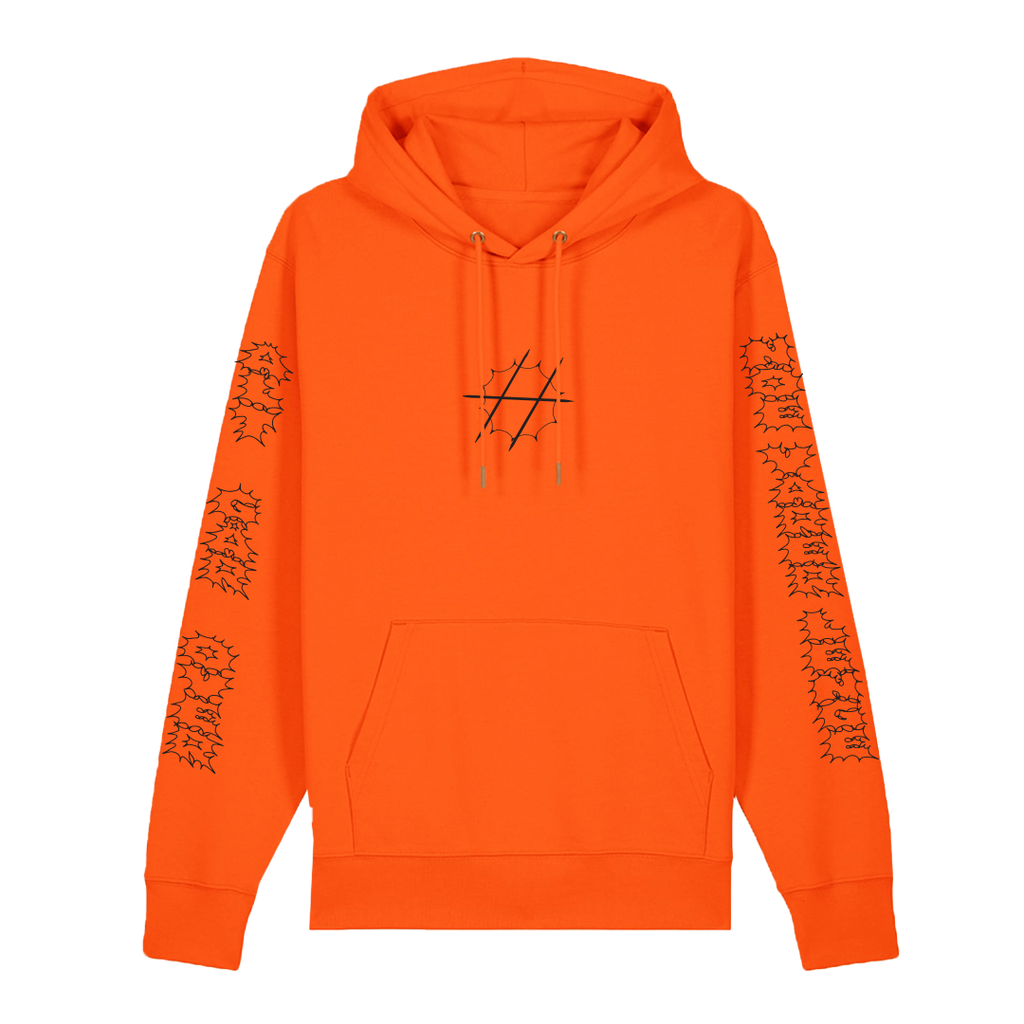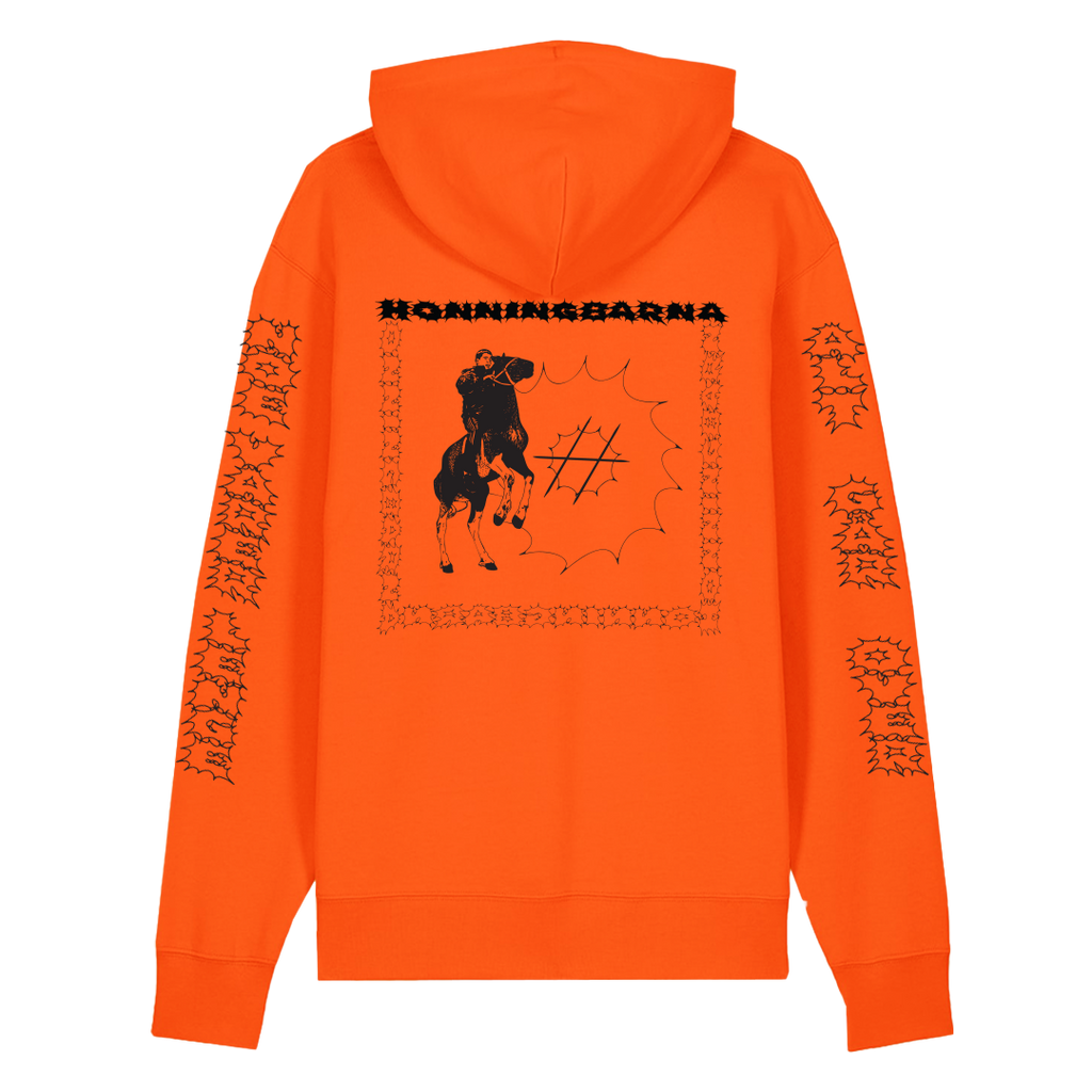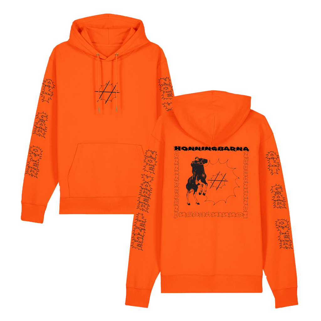 Oransje hettegenser med trykk på begge armer, rygg og front.