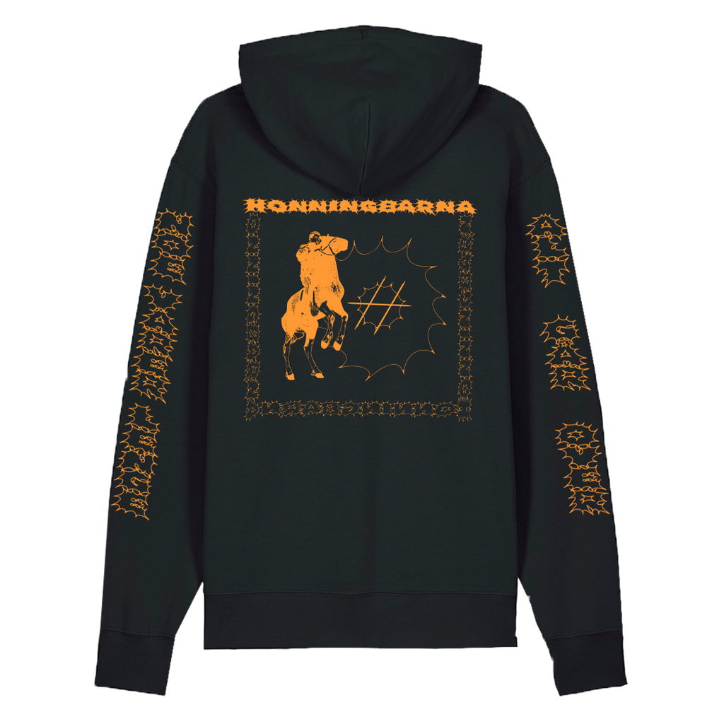 Sort hettegenser med trykk på begge armer, rygg og front.